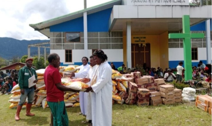 Atas krisis kemanusian ini, Keuskupan Timika menyalurkan bantuan kemanusiaan berupa 2 ton bahan makanan (Bama) kepada warga pengungsi dan umat Paroki Santo Petrus Ilaga, di Kabupaten Puncak, Papua Tengah.