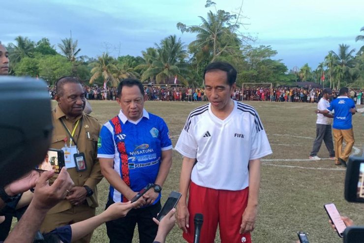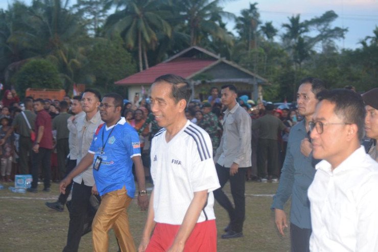 Presiden Jokowi tampil antusias mengenakan kaus putih dengan nomor punggung 23, bermain sepak bola bersama para pelajar. Semangat yang sama terpancar dari para pelajar yang mewakili sejumlah sekolah di Kabupaten Biak Numfor yang berusaha menggiring bola dan mencetak gol.