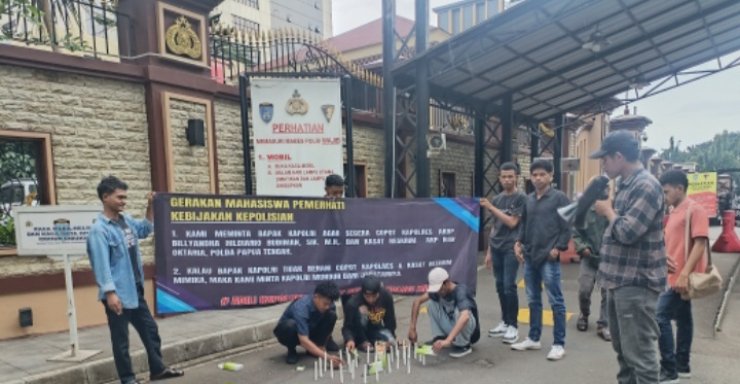 Mahasiswa yang tergabung dalam Gerakan Mahasiswa Pemerhati Kebijakan Kepolisian (GMPKK) menggelar Aksi bakar lilin di depan Gedung Mabes Polri, Jakarta Selatan, Rabu (1/10/2025).