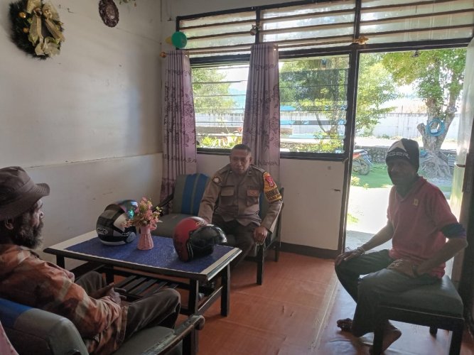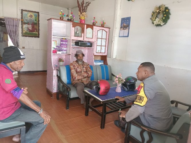 Dalam kegiatan sambang tersebut anggota Bhabin Aipda Rio Mandouwen menemui bapak Linder Mourin dan Hans Kogoya guna menjalin tali silaturahmi sekaligus memberikan pesan-pesan Kamtibmas menjelang Pemilu 2024.