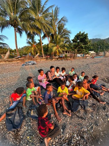 Bhabinkamtibmas Polres Kepulauan Yapen, Bripda Gina G.E Ansanay, Bersama anak-anak lakukan kegiatan bersih-bersih pantai sambil bercanda untuk memperkuat kedekatan srikandi polri dengan anak-anak papua
