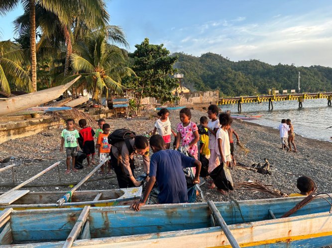 Bhabinkamtibmas Polres Kepulauan Yapen Bersama Anak-Anak Banawa Bersihkan Sampah di Pantai