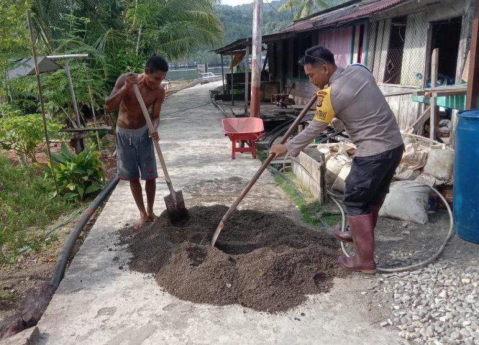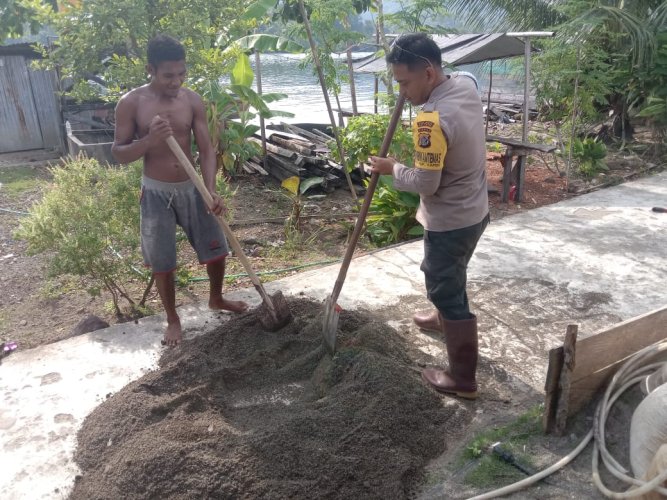 aksi Bripka Taufik Sanjaya, Bhabinkamtibmas Polres Kepulauan Yapen, membantu masyarakat bekerja di depan rumah
