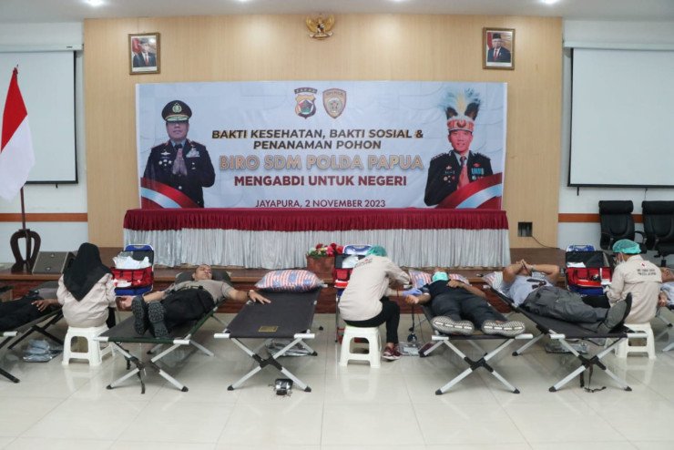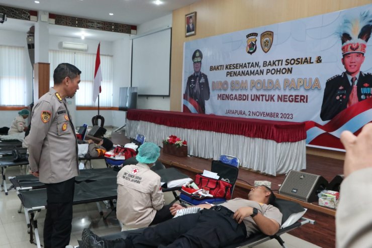 Papuanewsonline.com, Jayapura - Biro SDM Polda Papua menggelar kegiatan donor darah yang berlokasi di Aula Rastra Samara Polda Papua Lama, Kamis (2/11/2023).