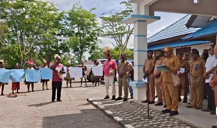 Masyarakat Adat Suku Wambon Kenemopte 13 Marga menggelar aksi damai di depan Kantor Bupati Boven Digoel, menuntut pemerintah daerah untuk segera menetapkan Surat Keputusan Pengakuan Wilayah Adat