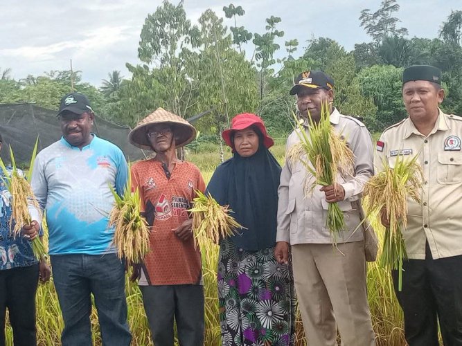 Bupati Roni Omba memimpin langsung panen padi di Kampung Asikie, Distrik Jair, sebagai bagian dari upaya pemerintah daerah memperkuat sektor pertanian skala kecil yang dinilai mampu meningkatkan kesejahteraan masyarakat serta mendorong kemandirian ekonomi