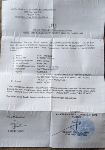 LP.B/94/X/2025/SPKT/Polres Tual/Polda Maluku, tertanggal 12 Oktober 2025.