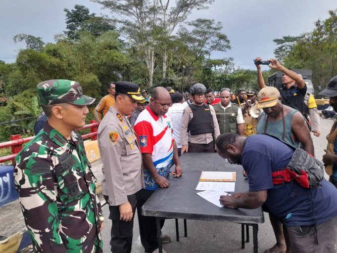 Kesepakatan tersebut dibuktikan melalui penandatanganan surat pernyataan oleh kedua belah pihak di lokasi pertikaian, yakni Jalan Poros Trans Nabire-Paniai, Kampung Gerbang Sadu, Distrik Nabire Barat, Kabupaten Nabire. (PNO-12)