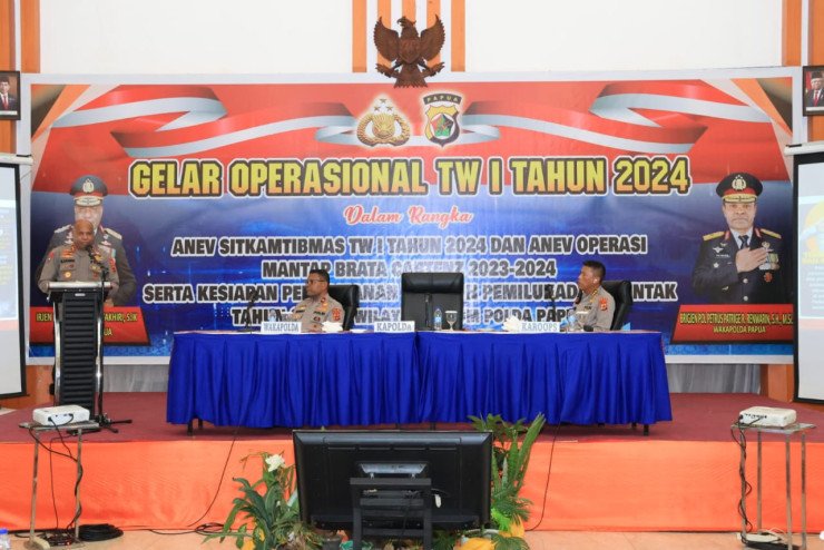 Papuanewsonline.com, Jayapura – Kepolisian Daerah Papua menggelar kegiatan Gelar Operasional (GO) Triwulan I Tahun 2024 dalam rangka Anev Sitkamtibmas TW I Tahun 2024 dan Anev Operasi Mantab Brata Cartenz 2023-2024 serta Kesiapan Pengamanan Tahapan Pemilukada Serentak Tahun 2024 di Wilayah Hukum Polda Papua yang dilaksanakan di Aula Ball Room GHB II Hotel Horison Kotaraja Kota Jayapura, Kamis (02/05/2024).