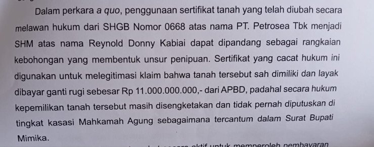 Pengadilan Negeri Mimika, terungkap bahwa PT Petrosea Tbk hanya dapat