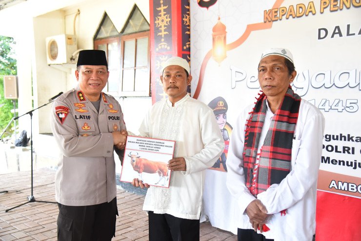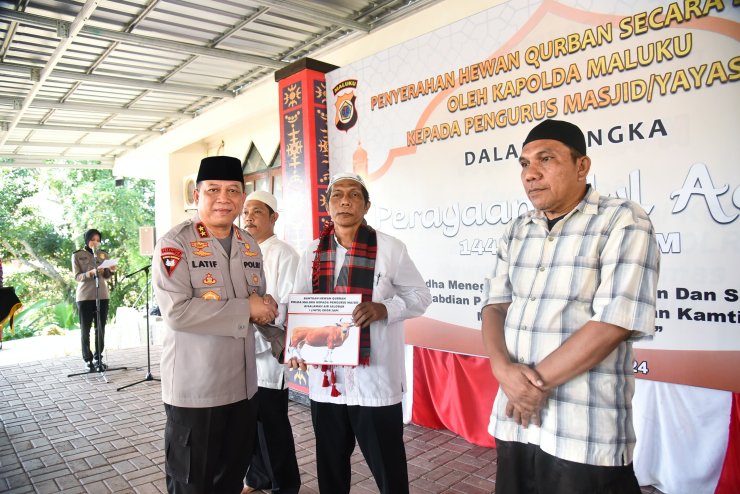 Papuanewsonline.com, Ambon - Kapolda Maluku Irjen Pol Drs Lotharia Latif SH., M. Hum., menyerahkan hewan Qurban Kepada beberapa perwakilan Pengurus Masjid yang mendapat penyaluran hewan kurban dari Polda Maluku, bertempat di Masjid At Taqwa Polda Maluku Tantui, Jumat 14/06/2024.