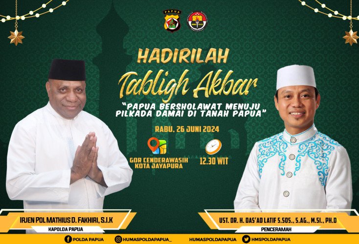 Papuanewsonline.com, Jayapura – Kapolda Papua, Irjen Pol Mathius D. Fakhiri, S.I.K bersama Kapolresta Jayapura Kota, Kombes Pol. Dr. Victor D. Mackbon, S.H., S.I.K., M.H., M.Si menggelar Giat Tabligh Akbar dalam rangka Papua Bershalawat Menuju Pemilukada Damai di Tanah Papua. Acara ini akan diselenggarakan di GOR Cenderawasih Jayapura pada Rabu, 26 Juni mendatang.