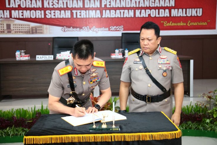 Papuanewsonline.com, Ambon – Momentum pergantian kepemimpinan di tubuh Kepolisian Daerah Maluku kembali ditandai dengan prosesi penting. Kapolda Maluku Irjen Pol Prof. Dr. Dadang Hartanto, S.H., S.I.K., M.Si., bersama Irjen Pol Drs. Eddy Sumitro Tambunan, M.Si. secara resmi menandatangani memori Serah Terima Jabatan di ruang rapat utama lantai 5 Mapolda Maluku, Selasa (26/8/2025).
