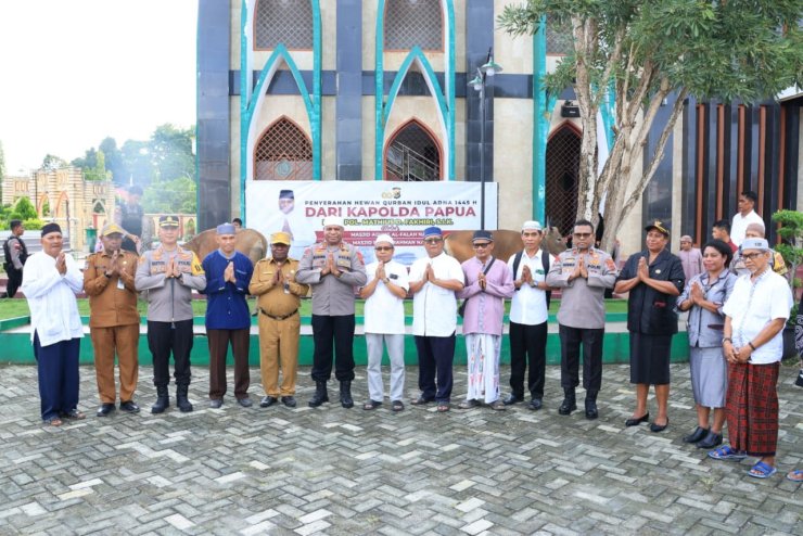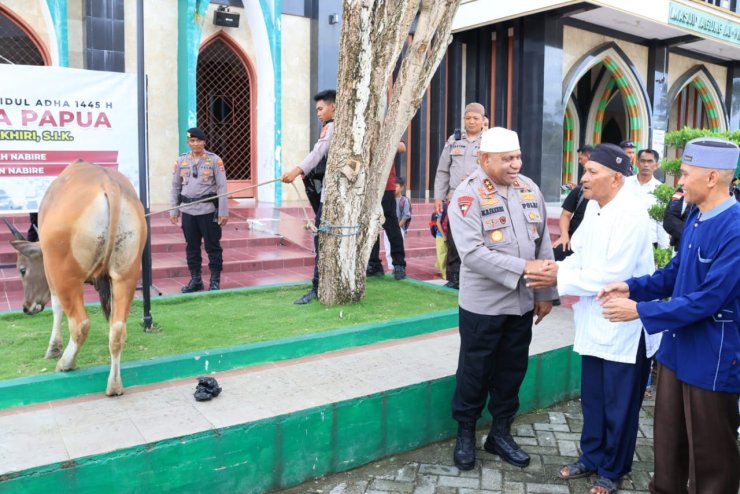 Dalam rangka menyambut Idul Adha 1445 Hijriah,Kapolda Papua bersama rombongan menyerahkan hewan qurban kepada dua masjid di Nabire,yakni Masjid Agung Al-Falah Nabire dan Masjid Baiturrahman Oyehe Nabire.