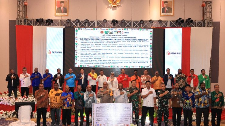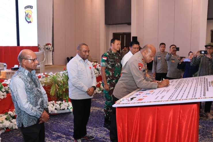 Dalam mencapai tujuan mewujudkan Pemilu yang jujur, aman, dan demokratis di Provinsi Papua, Kapolda Papua bersama Pj. Sekda Provinsi Papua, Kapoksahli Kodam XVII/Cenderawasih, Kasubbag Opsin Binda Papua, Ketua KPU Provinsi Papua, Ketua Bawaslu Provinsi Papua membacakan nota kesepakatan bersama mewujudkan Pemilu tahun 2024 jujur, aman dan demokratis di Provinsi Papua yang diikuti oleh para seluruh peserta. (PNO-12)