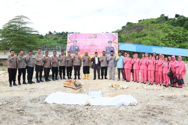 Kapolda Papua, Irjen Pol. Mathius D. Fakhiri, S.I.K secara simbolis mengawali Peletakan Batu Pertama Pembangunan Gereja Oikumene, Masjid dan Pura Polda Papua, yang berlangsung di depan Venue Volly Koya Koso, Distrik Muara Tami, Kota Jayapura, Jumat (02/02/2024).