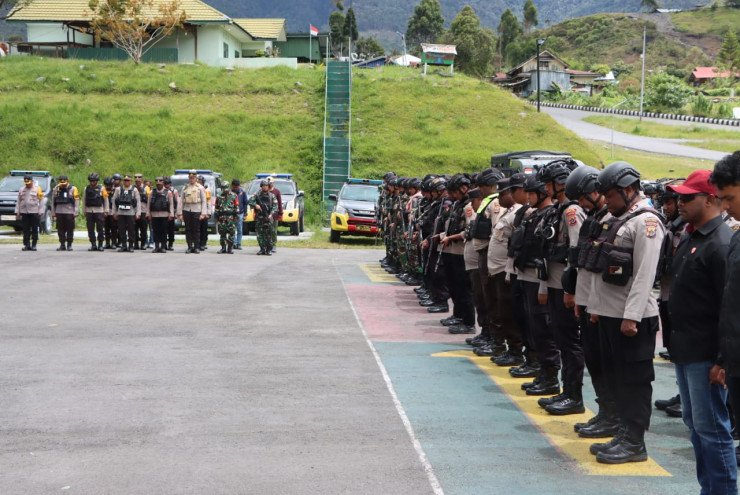 Kapolres Puncak Jaya AKBP Kuswara, S.H., S.I.K., M.H bersama Dandim 1714/PJ Letkol Inf. Irawan Setya Kusuma, S.Hub.Int, pimpinan upacara pelaksanaan kegiatan apel gabungan yang digelar di Makodim 1714/PJ