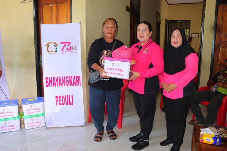 Sementara itu, Ketua Bhayangkari Cabang Tual Ny. Rani Adrian Tuuk turut mendampingi dalam penyerahan paket sembako yang diberikan kepada lima keluarga korban kebakaran.