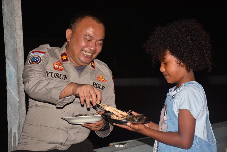Papuanewsonline.com, Mimika – Suasana penuh kehangatan dan kebersamaan tampak dalam sebuah momen istimewa di Kabupaten Mimika, Papua Tengah, Sabtu (1/2). Wakasatgas Humas Operasi Damai Cartenz-2025, Kompol Yusuf Tauziri, S.I.K., terlihat akrab berbagi makan malam bersama seorang anak Papua, mencerminkan pendekatan humanis yang terus dikedepankan dalam menjaga kedamaian di Bumi Cenderawasih.