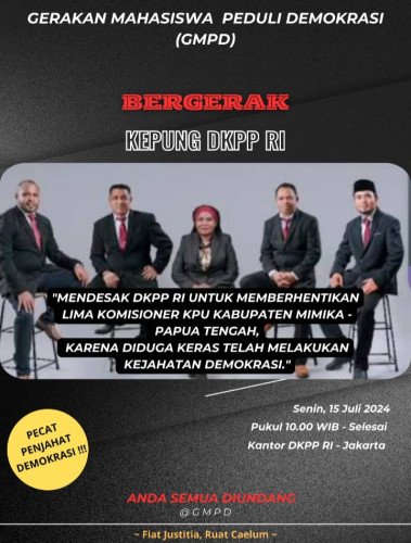 Dalam aksi ini, GMPD mendesak DKPP RI agar melakukan pemecatan terhadap 5 Komisoner KPU Mimika, karena diduga keras melakukan kejahatan demokrasi yang telah mencoreng tegaknya demokrasi di Indonesia.