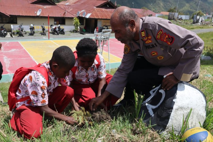 Lestarikan Alam, Polres Puncak Jaya Ajak Anak-anak Tanam Pohon di Depan Mako Polres