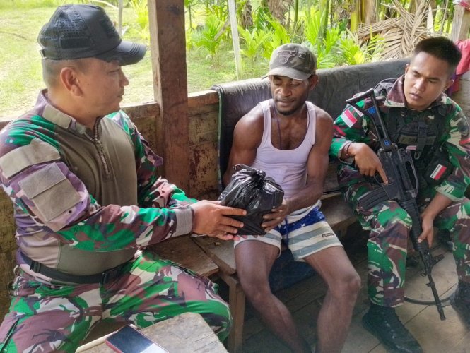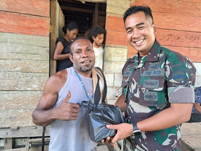 Personel Satgas Pamtas RI-PNG Yonif 122/TS Pos KM 76 dipimpin sersan dua Heri Juanda memberikan sembako kepada masyarakat Kampung Uskuar yang bertujuan untuk mempererat hubungan persaudaraan antara TNI dengan masyarakat agar adanya keberadaan Satgas ditengah-tengah masyarakat bisa menjadi terciptanya hubungan menjaga keutuhan wilayah perbatasan darat RI-PNG.