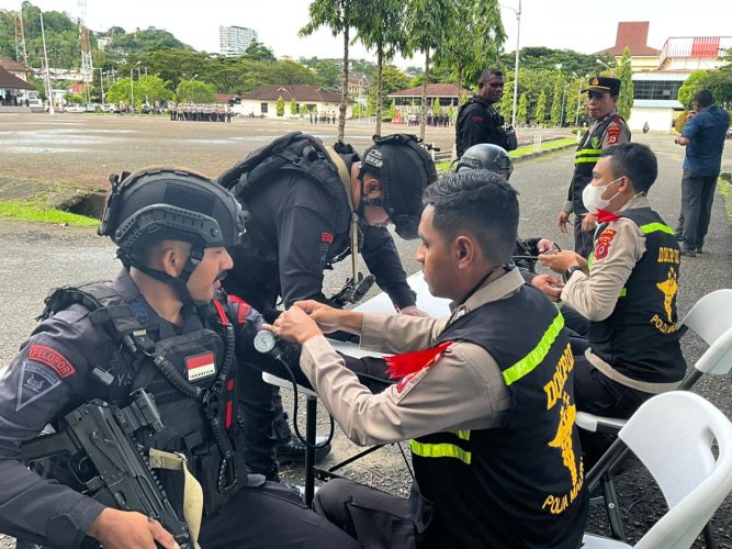 Tim kesehatan Bid Dokkes Polda Maluku melakukan sejumlah pemeriksaan dasar kepada personel, di antaranya pengecekan tekanan darah, pemberian vitamin, serta layanan konsultasi kesehatan bagi anggota yang akan melaksanakan tugas pengamanan di berbagai titik operasi.