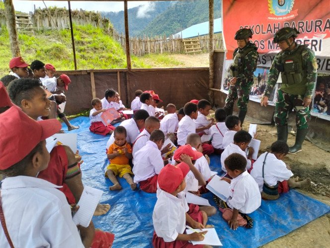 Papuanewsonline.com, Puncak - Pos Mayuberi Satgas Mobile Yonif 323 Buaya Putih mengabdi tanpa henti untuk anak-anak pedalaman Papua dengan tetap mengajar di sekolah darurat, Distrik Ilaga Utara, Kabupaten Puncak, Papua Tengah, Rabu (31/07/2024)