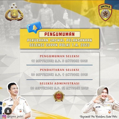 ASSDM Kapolri Irjen. Pol. Prof. Dr. Dedi Prasetyo, M.Hum., M.Si., MM. menyampaikan bahwa terdapat perubahan jadwal pelaksanaan seleksi CPPPK Polri T.A 2023, yaitu pengumuman seleksi akan dilaksanakan pada 19 September s.d 3 Oktober 2023, pendaftaran seleksi akan dilaksanakan pada 20 September s.d 9 Oktober 2023, dan seleksi administrasi akan dilaksanakan pada 20 September s.d 12 Oktober 2023.