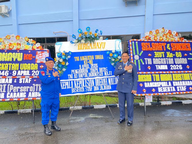 Papuanewsonline.com, Ambon – Polda Maluku menegaskan komitmen memperkuat sinergitas TNI–Polri dengan memberikan ucapan selamat Hari Ulang Tahun (HUT) ke-80 TNI Angkatan Udara kepada Lanud Pattimura Ambon, Kamis (9/4/2026).