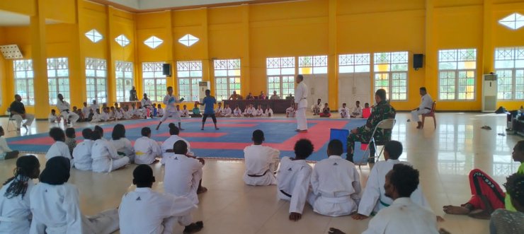 Papuanewsonline.com, Mappi - Anggota Pos Mur Satgas Yonif 125/SMB memberikan pelatihan kepada ratusan karateka Kabupaten Mappi di GOR Qhiandauri, Distrik Obaa, Mappi, Kamis (11/7/2024).