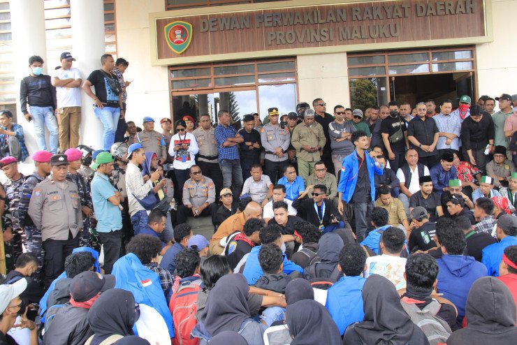 Polda Maluku, Polresta Ambon, dan TNI bersinergi menjaga keamanan demonstrasi besar Aliansi Masyarakat, OKP Cipayung Plus, dan BEM Nusantara di Gedung DPRD Provinsi Maluku