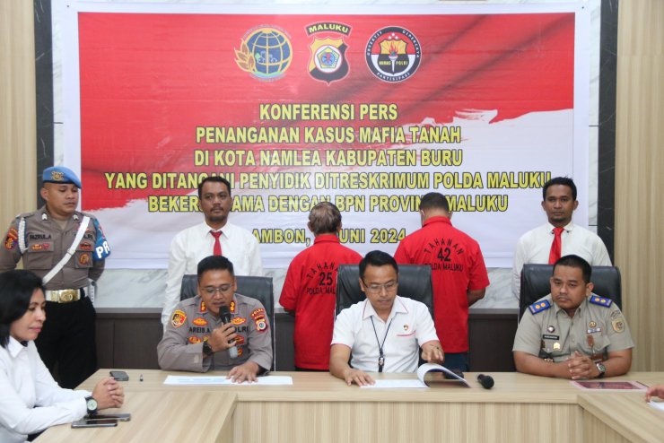 Pengungkapan kasus mafia tanah diungkapkan Polda Maluku melalui konferensi pers yang dipimpin Plt Kabid Humas Polda Maluku, AKBP. Aries Aminnullah. Turut hadir Direktur Reskrimum Polda Maluku Kombes Pol Andri Iskandar dan Kabid Pengendalian dan Penanganan Sengketa BPN Provinsi Maluku, Hardiansyah.