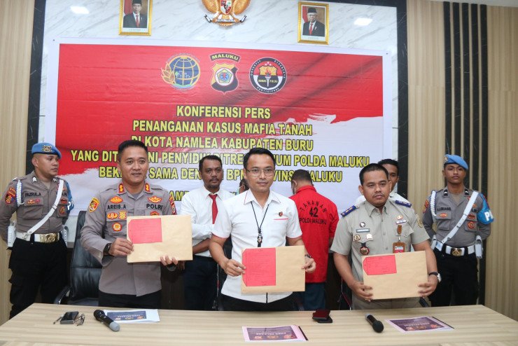 "Hari ini kita akan sampaikan pengungkapan kasus mafia tanah di Kota Namlea Kabupaten Buru dengan pelapor atas nama Muhammad Dermawan," kata AKBP Aries.