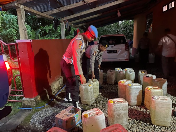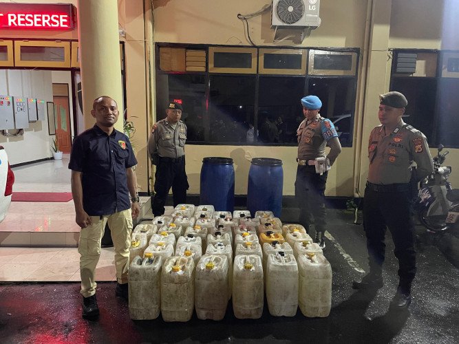 Miras tradisional tersebut ditemukan tersimpan di dalam 40 jerigen berukuran 25 liter. Ribuan liter minuman memabukan ini ditemukan di rumah SS (59), warga Alang.