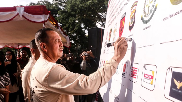 Berikut Naskah Deklarasi Kampanye Damai yang dibacakan oleh Ketua Bawaslu dan seluruh Pengurus Parpol: