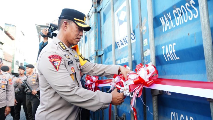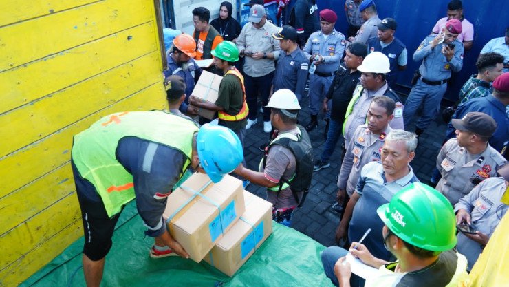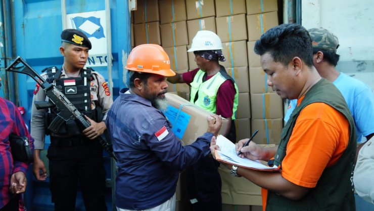 Proses pembongkaran kontainer ditandai dengan pengguntingan pita oleh Ketua KPU Maluku Samsul Rifan Kubangun, Karo Ops Polda Maluku Kombes Pol Asep Saepudin, Kepala Kesbangpol Maluku Daniel Indey, dan Ketua Bawaslu Maluku Subair.