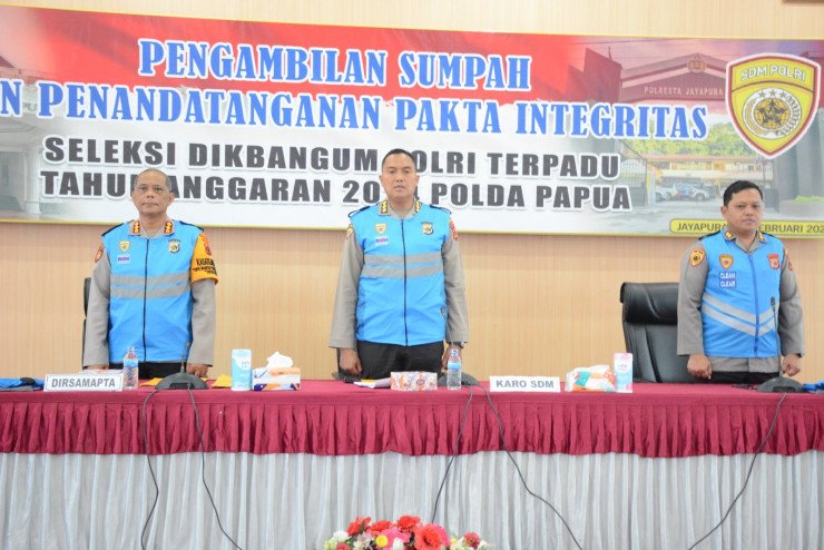 Pelaksanaan pengambilan sumpah dan penandatanganan Pakta Integritas dilaksanakan di Aula Rastra Samara Polda Papua lama, Kota Jayapura, dengan mengikuti zoom meeting dari Mabes Polri yang dipimpin oleh Karo Watpers SSDM Polri Brigjen. Pol. Anwar S.I.K. M.Si., Senin (26/02/2024).