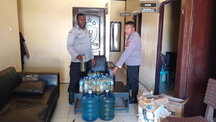 “Jumlah barang bukti minuman keras sebanyak 62 liter terdirin dari 2 galon @19 liter = 38 liter, 4 botol Aqua @1500 ml = 6 liter dan 31 botol Aqua @600 ml = 18 liter, Saat ini pemilik dan barang bukti diamankan di Polsek Pomako guna dilakukan proses hukum,” terangnya.