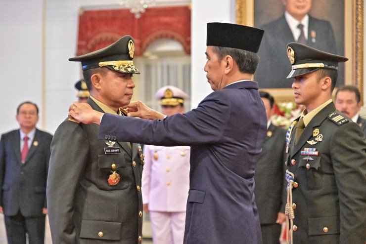 Dalam kesempatan tersebut Presiden Joko Widodo menyematkan tanda pangkat dan menyerahkan tongkat komando kepada Jenderal TNI Agus Subiyanto.