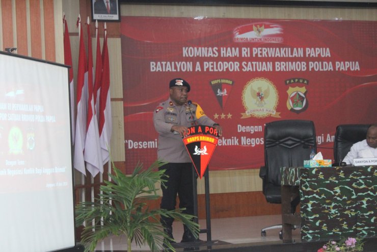 Dalam sambutannya, Danyon A Pelopor menyampaikan ucapan terimakasih kepada Ketua Komnas HAM RI Perwakilan Provinsi Papua yang telah hadir dalam kegiatan sosialisasi ini.