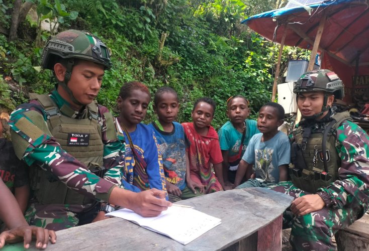 Satgas Mobile Buaya Putih Kostrad Ajari Baca Tulis di Sekolah Darurat