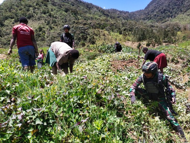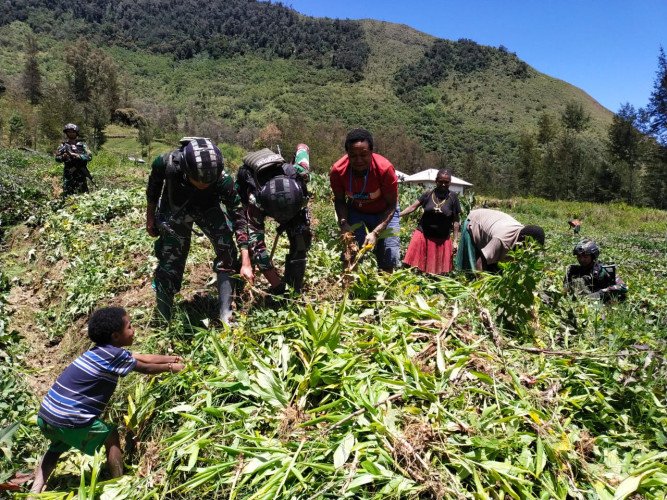 Personel Satgas Mobile Raider 300 Siliwangi membantu masyarakat Kampung Mundiba termasuk Mama Elin Labene (37 tahun), Mama Elprida Labene (34 tahun) dan Mama Piton Labene (36 tahun) dengan antusias panen Ubi, Keladi dan Talas di kebun Mama Elin Labene. Mereka bergotong royong membersihkan kebun dan menghasilkan hasil panen yang memuaskan.