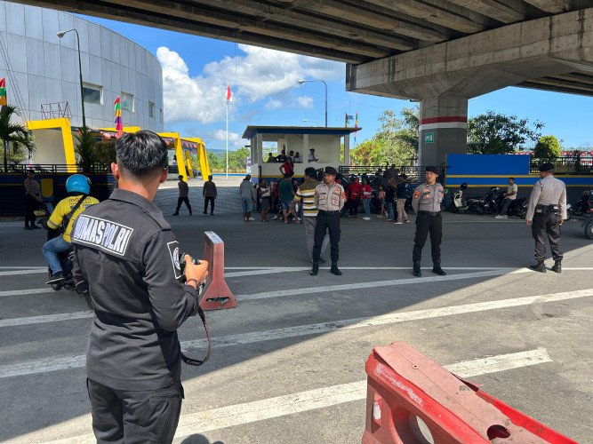 Papuanewsonline.com, Ambon - Satuan Tugas Operasi Mantap Brata (Satgas OMB) Salawaku Polda Maluku melakukan pengaturan lalu lintas di kawasan lampu lima atau tepat di bawah Jembatan Merah Putih (JMP), Jumat (1/12/2023).