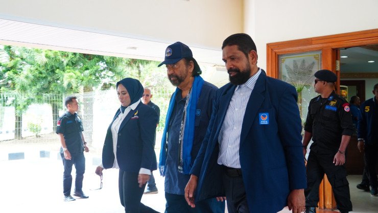 Surya Paloh mengunjungi Ambon dalam kegiatan konsolidasi internal partai tersebut yang dihelat di Ballroom Natsepa Hotel, Desa Suli, Kecamatan Salahutu, Kabupaten Maluku Tengah, Rabu (7/2/2024).