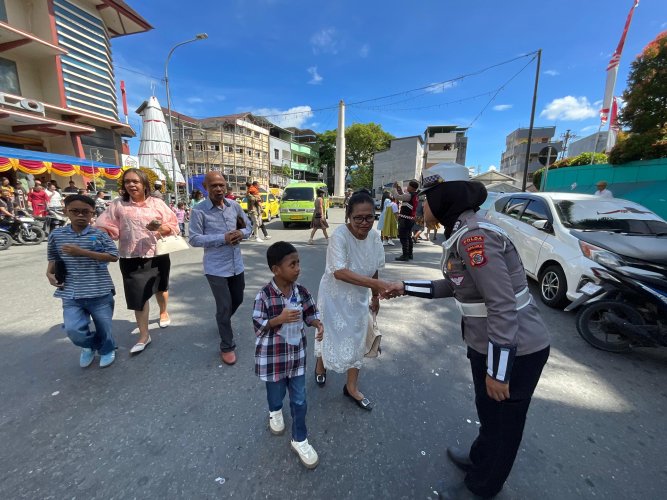 Tak hanya fokus pada aspek pengamanan, personel Operasi Lilin Salawaku 2025 juga menjalankan pendekatan humanis. Petugas melakukan pengaturan arus lalu lintas, membantu jemaat lanjut usia menyeberang jalan, serta menyapa dan berinteraksi langsung dengan masyarakat yang hadir mengikuti ibadah.