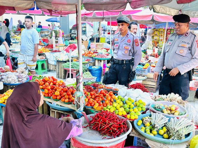 Di Pasar Mardika, petugas menyapa dan berdialog dengan masyarakat baik para pedagang maupun pembeli terkait situasi kamtibmas.