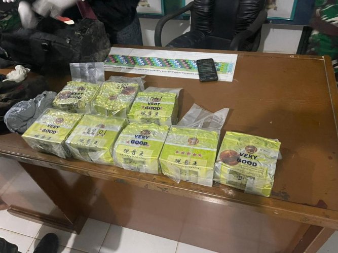 "Setelah selama kurang lebih dua hari melaksanakan patroli, pada hari ini,tadi dini hari sekitar pukul 04.15 WIB, Tim patroli berhasil mengamankan pelaku yang membawa ransel, yang saat diperiksa berisi 10 paket kristal putih dalam kemasan Teh Guanyinwang diduga sabu seberat kurang lebih 10 Kilogram," ungkap Dansatgas.