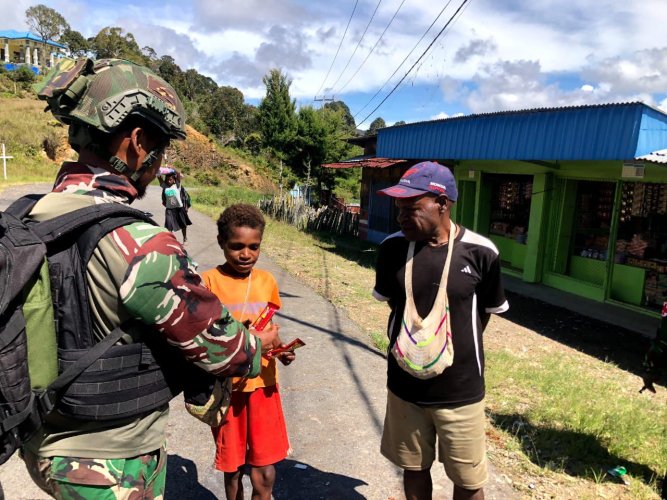 Satgas TNI Patroli Dan Berbagi Sembako Dengan Warga Bilogai