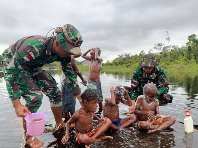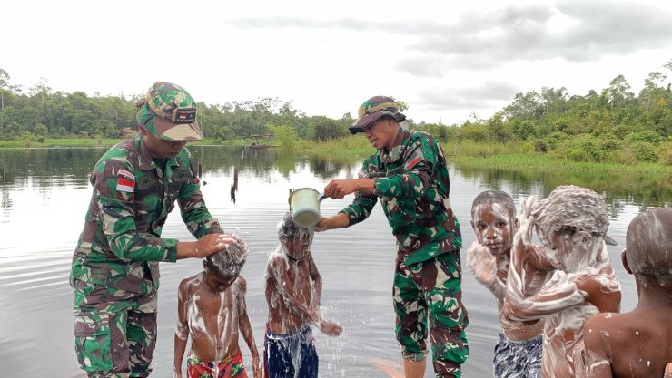 Dalam keterangan tertulis Danpos Senggo Lettu Inf Okta Yudha di Distrik Citak Mitak, Kamis (18/07/2024) mengatakan Belajar mandi bersih dilakukan di sungai mereka ditemani Serda Ibay dan Prada Yohata.
